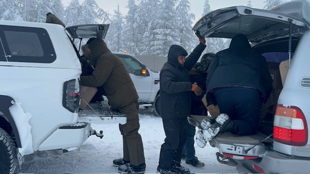 Слава Богу, мы смогли пообщаться с сестрой Ульяной, пели, читали вместе Евангелие, укрепляясь Господом и могуществом силы Его, оставили ей продуктовые наборы чтобы она раздала малоимущим жителям поселка. На выезде из поселка мы встретили машину полиции, которые наблюдали как мы уезжаем из поселка Оленек. У нас было ощущение, что мы попали в советское время, за нами следили, второй машине мы сообщили по спутниковому телефону, чтобы они на обратном пути забрали литературу, спрятанную нами. И братьям, живущим в поселке Удачный, также позвонили по спутниковому телефону и попросили, чтобы они приехали к нам на встречу на зимник, и мы перегрузим в их машины литературу, которую мы смогли сохранить.